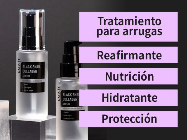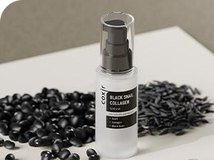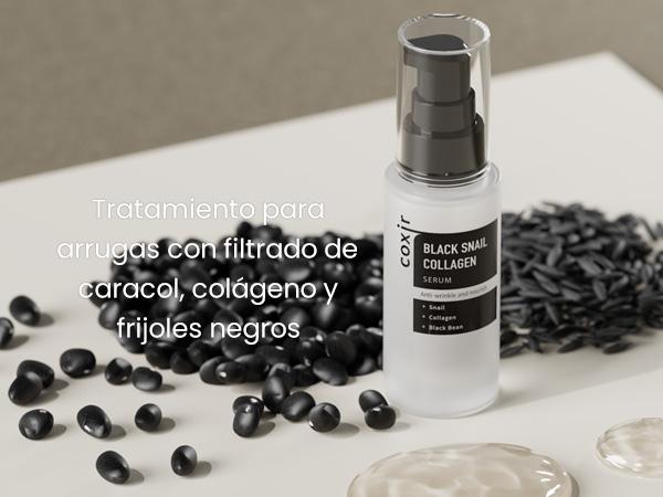 Serum facial formulado con extracto de baba de caracol, colágeno y extracto de ingredientes de color negro como frijol negro, sésamo negro y arroz negro que tiene efectos antioxidantes.